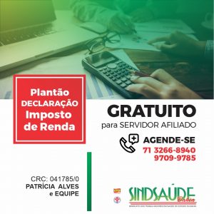 O SindSaúdeBa oferece atendimento gratuito para esclarecer dúvidas e a para realizar a declaração do Imposto de Renda (IR). Por conta da pandemia, não realizamos o IR Itinerante nas unidades da capital e interior, mas aproveitando as tecnologias para auxiliar servidores públicos na capital e no interior no processo.