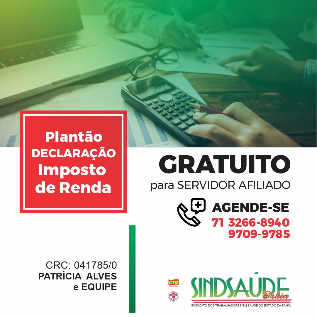O SindSaúdeBa continua ajudando todos os servidores públicos da saúde associados. Na reta final da declaração do Imposto de Renda, a entidade realiza nesta sexta-feira, 28 de maio, até a segunda-feira, 31 de maio, prazo final da Declaração do Imposto de Renda plantão presencial e virtual. Hoje, sexta-feira (28) e segunda-feira (31), das 8:30h às 17h – atendimento presencial – na sede e no sábado (29), virtual, com equipe da Contadora Patrícia Alves do SindSaúdeBa.