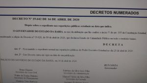 O Governo do Estado da Bahia indo na contra mão do pedido de isolamento, ontem, dia 16 de abril de 2020, no diário oficial, através do Decreto 19.642, no uso da atribuição com base do Art 105 da Constituição Estadual, considerando o Decreto 19.626, que declarou Estado de Calamidade Pública em todo território baiano.