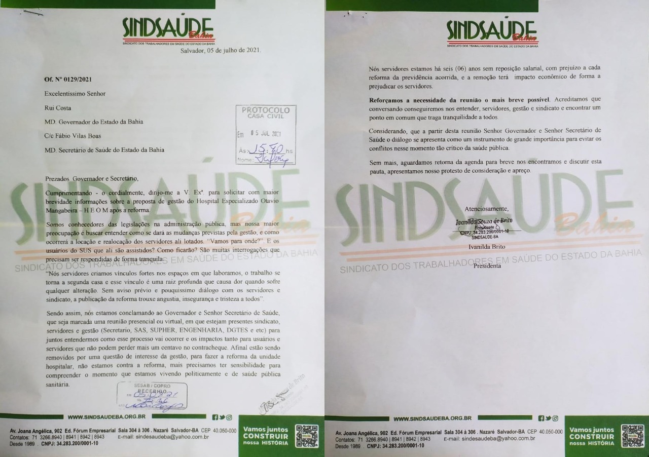 Nesta linha da defesa dos direitos dos trabalhadores e servidores (as) públicos da SESAB, o sindicato oficializou através de ofício (lado), um pedindo de explicação e que o Governo do Estado da Bahia, ao então governador Rui Costa do Partido do Trabalhadores, que garanta todos os direitos dos trabalhadores e retorno a unidade, após a reforma garantindo a excelência no atendimento do Hospital Especializado Octávio Mangabeira.