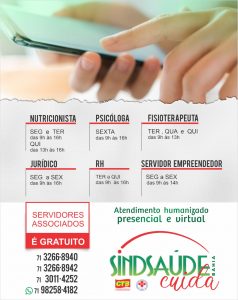 “É com muito orgulho que retornamos com os atendimentos do Sindsaúde Cuida. Ele foi pensado e criado pelo Sindicato de forma a beneficiar os filiados, com uma alternativa segura de atendimento especializado. Temos profissionais gabaritados e o que é melhor, os atendimentos são gratuitos. A saúde dos nossos servidores é o nosso maior presente em 2022”, acrescentou Ivanilda Brito, presidente do SindSaúde Bahia.