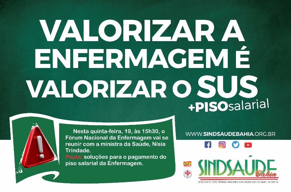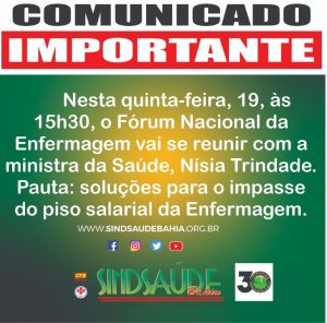 Nesta quinta-feira, 19, às 15h30, o Fórum Nacional da Enfermagem, com participação do Sindsaúde Ba vai se reunir com a ministra da Saúde, Nísia Trindade. Eles vão discutir soluções para o impasse do piso salarial da Enfermagem. Em declarações recentes, a ministra da saúde assegurou o compromisso do Governo Federal com a Enfermagem brasileira e que pagamento do piso será uma das pautas centrais da gestão. Além disso, a ministra também garantiu que montará um Grupo de Trabalho para que aprove no âmbito do governo uma forma de pagamento desse recurso. O Sindsaúde Bahia segue lutando incansavelmente, buscando solucionar o impasse para que os profissionais da categoria possam alcançar a sua tão sonhada valorização salarial e amplia as pautas como: insalubridade, URV, Concursos Públicos e outras pautas para servidores públicos da saúde.
