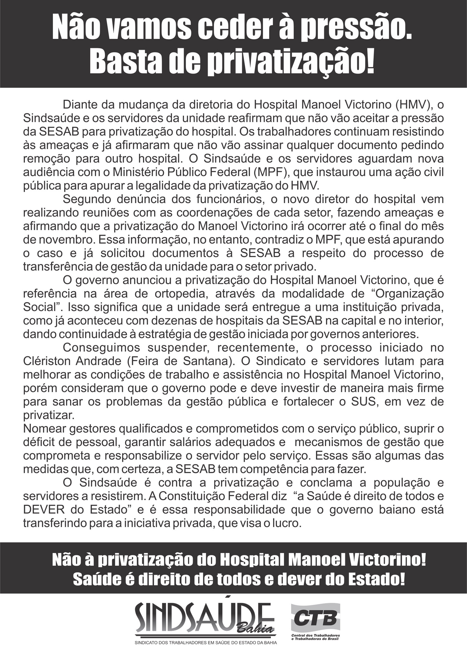 DESTAQUES Reunião com servidores para discutir privatização do Manoel Victorino nesta segunda (25) 25/11/2013 por ascom 0 comentários Compartilhar: Share on: 0