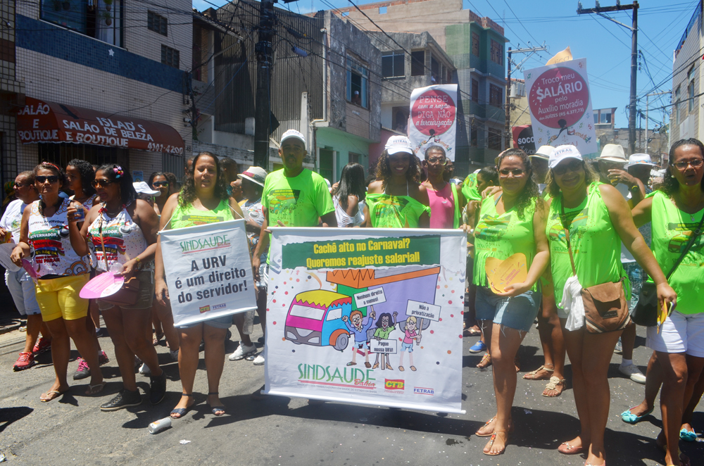 Com slogan “Cachê alto no Carnaval? Queremos reajuste salarial”, servidores da Saúde participaram da tradicional Mudança do Garcia, Circuito Riachão, na segunda-feira de carnaval (08/02), para reivindicar o reajuste salarial do funcionalismo público estadual e as principais bandeiras da categoria como o pagamento da URV, melhores condições de trabalho, valorização profissional, contra a retirada de direitos e contra a privatização da saúde pública.
