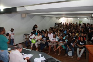 Com o auditório do Sindicato dos Bancários lotado, os servidores da Secretaria da Saúde do Estado, liderados pelo Sindsaúde-Ba, decidiram nesta segunda-feira (4) pela manhã, em assembleia geral do dia de paralisação contra a proposta de reajuste enviada pelo governo à Assembleia Legislativa, sair em passeata pelo Centro da cidade. Carregando um caixão, o “cortejo fúnebre” seguiu pela Avenida Sete de Setembro e retornou pela Rua Carlos Gomes até o Campo Grande. O enterro simbólico do projeto foi em protesto contra o percentual de 6,41% parcelado em duas vezes (3,5% retroativo a março e 2,9% em novembro).