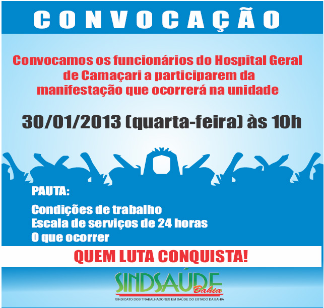 Servidores do Hospital Geral de Camaçari (HCM) realizarão manifestação em frente à unidade, nesta quarta-feira (30/01), às 10h, em protesto contra as condições de trabalho e escala de serviços dos trabalhadores.