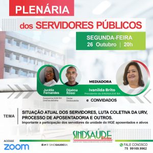 Com a proposta de participação em massa de servidores públicos do Hospital Geral do Estado, o SindSaúdeBahia reúne através do aplicativo zoom, nesta segunda-feira, 26 de outubro, às 20horas, uma plenária para levantamento de pauta e demandas dos servidores públicos do HGE. O objetivo é discutir ações e estratégicas de proteção aos trabalhadores da saúde.