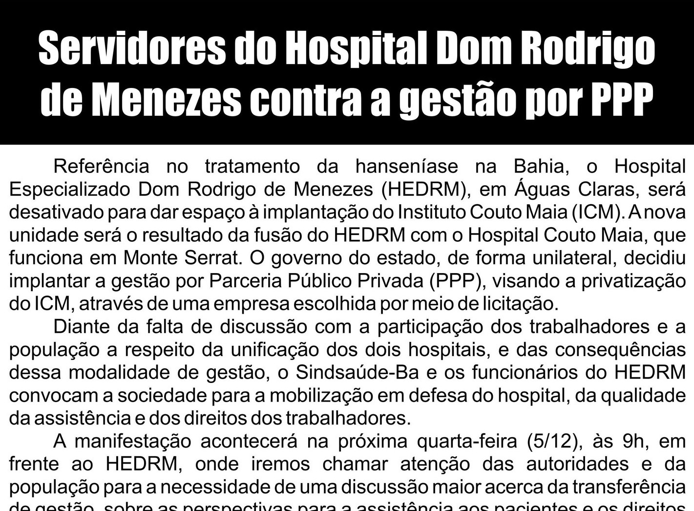 Diante da falta de discussão com a participação dos trabalhadores e a população a respeito da unificação dos dois hospitais, e das consequências dessa modalidade de gestão, o Sindsaúde-Ba e os funcionários do HEDRM convocam a sociedade para a mobilização em defesa do hospital, da qualidade da assistência e dos direitos dos trabalhadores.