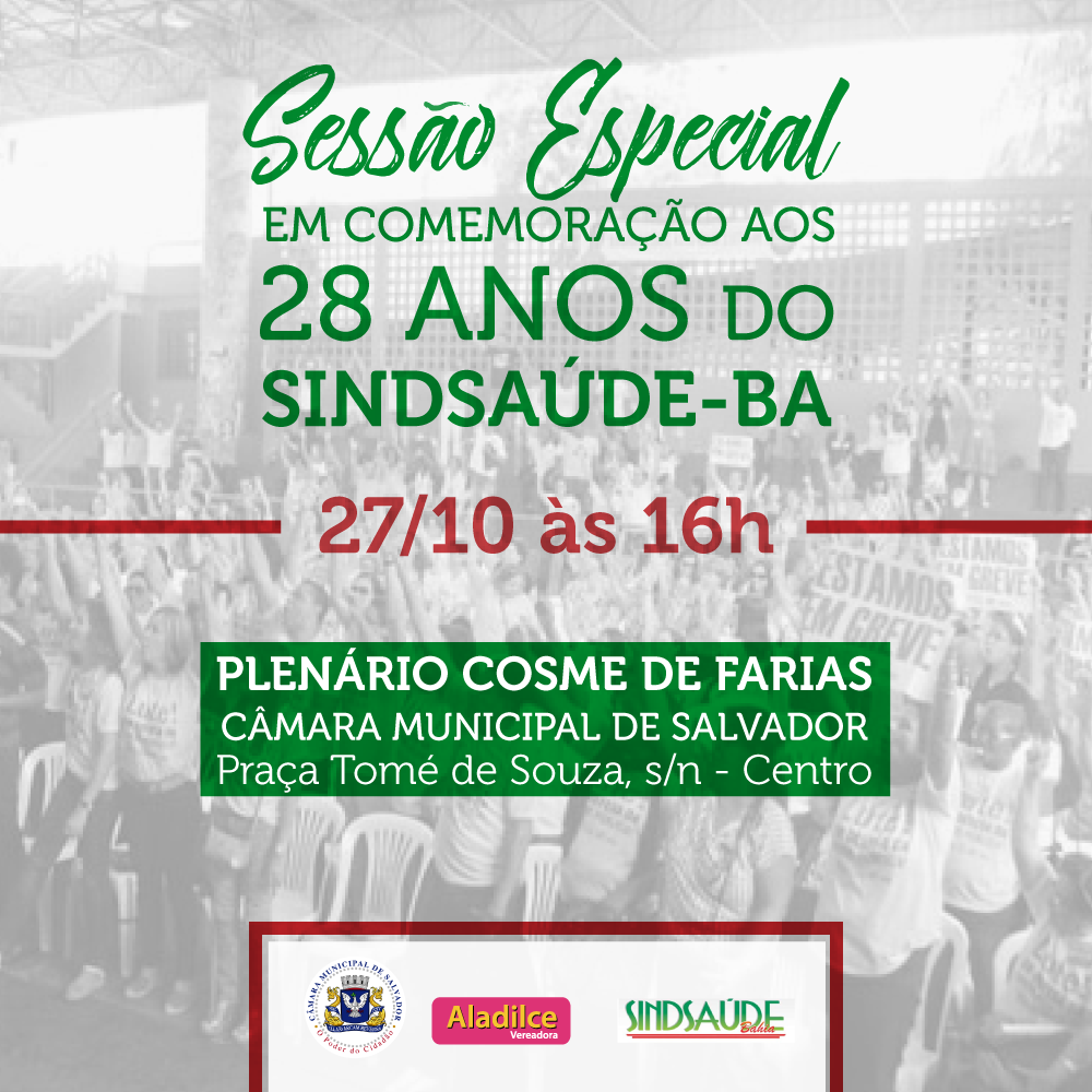 O Sindicato dos Trabalhadores em Saúde do Estado da Bahia (Sindsaúde-BA) completa neste mês 28 anos de lutas em defesa da categoria e do fortalecimento do SUS. Como reconhecimento, a vereadora e enfermeira Aladilce Souza (PCdoB) realizará sessão especial para celebrar a data. O evento será nesta sexta-feira (27), às 16h, na Câmara Municipal de Salvador.
