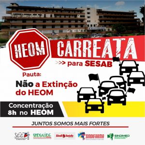 Para evitar a extinção da unidade e preocupados com o futuro dos servidores públicos da SESAB e os trabalhadores no geral, na próxima quarta-feira, 07 de julho, as entidades como, o Sindicato dos Trabalhadores em Saúde, Sindsaúde Bahia, Sindicato dos Enfermeiros da Bahia, Seeb Ba, Sindicato dos Farmacêuticos do Estado da Bahia, Sindifarma Ba, Sindicato dos Médicos do Estado da Bahia, Sindimed Ba e o Sindicato dos trabalhadores em Saúde da Rede Privada, Sindisaúderp realizam uma carreata.