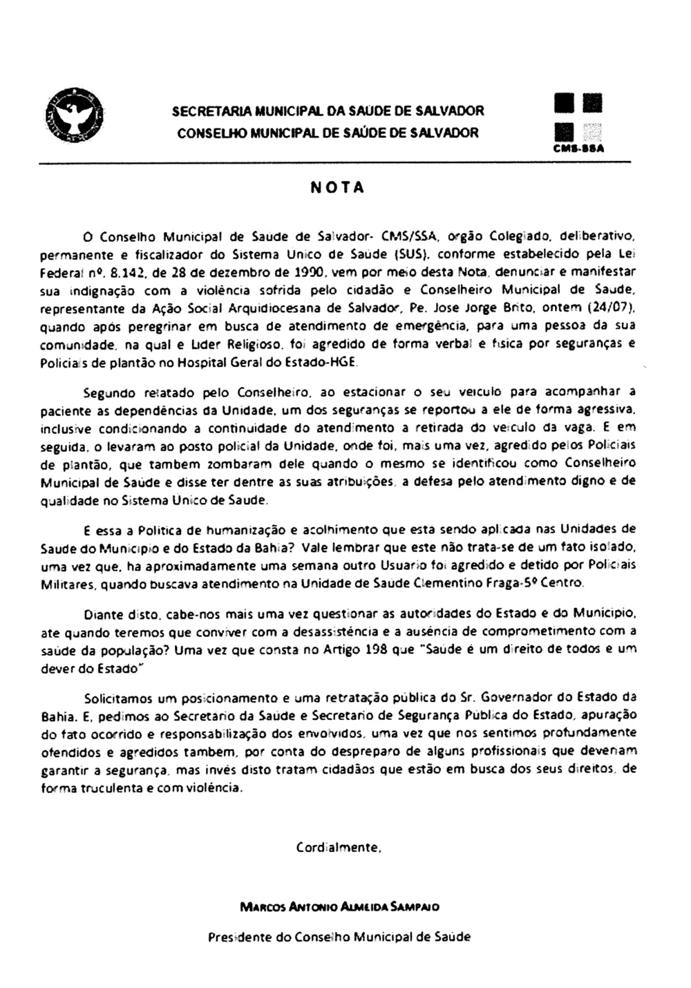 O Sindsaúe-Ba apoia a nota enviada pelo Conselho Municipal de Saúde, que denuncia e manifesta indignação contra a agressão sofrida pelo conselheiro, padre José Jorge Brito, praticada por seguranças e policiais de plantão no Hospital Geral do Estado, no dia 24 de julho. Representante da Ação Social Arquidiocesana de Salvador (ASA) e defensor da saúde pública, o religioso foi agredido quando prestava socorro a uma pessoa de sua comunidade. O Sindsaúde-Ba, junto com as outras entidades e movimentos sociais, já solicitou audiência na corregedoria de polícia para discutir o caso e, também, aguarda posição dos órgãos públicos sobre a agressão.