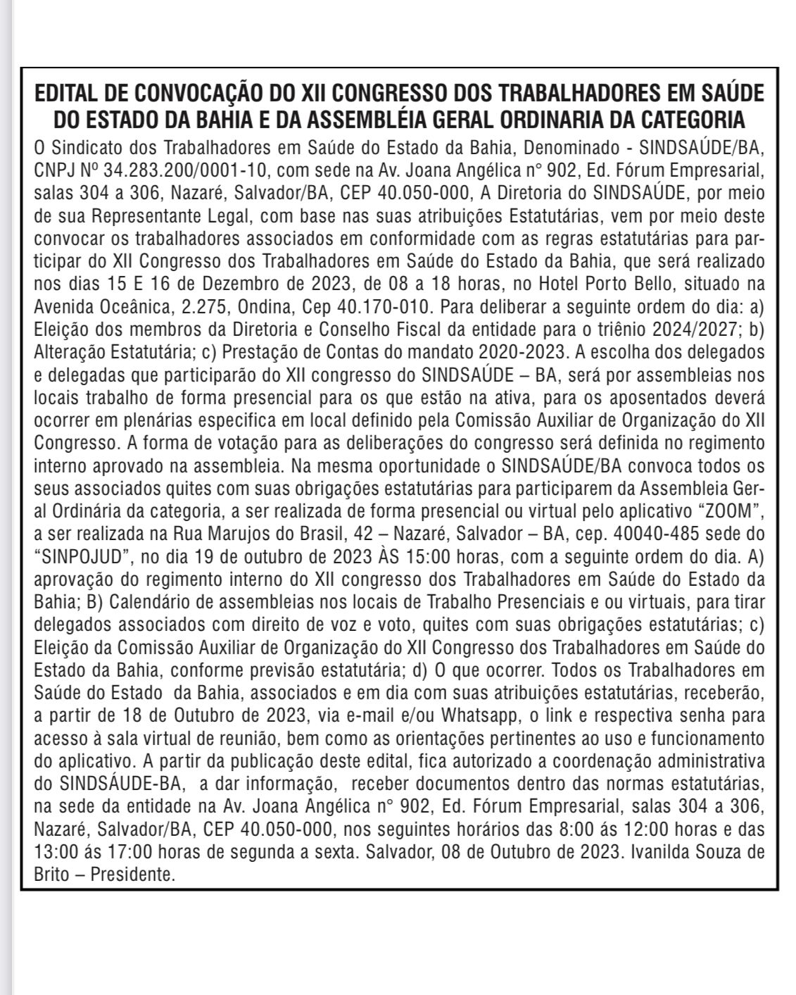 O Sindsaúde Bahia divulgou o Edital de Convocação para seu 12 Congresso Estadual, que acontece nos dias 15 e 16 de dezembro, de 8 a 18h, no Hotel Porto Bello, Salvador, seguindo todos os trâmites legais.