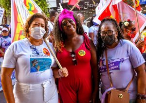 “Nós mulheres somos sempre negligenciadas. Trabalhamos mais. Temos uma tripla jornada e ganhamos menos. Temos menos reconhecimento. Sofremos com o machismo, com o preconceito, e muitas sofrem com o racimo. Isto tem que ter um fim. Precisamos ser tratadas de forma igual. Por isto estamos na rua hoje. E o Sindsaúde Bahia, também está aqui defendendo as profissionais da saúde, que estiveram na linha de frente contra a Covid 19 e precisam de reconhecimento e valorização. Nós fomos as primeiras a fritar Fora Bolsonaro e este grito está de volta”, acrescentou Ivanilda Brito, presidente do Sindsaúde Bahia.