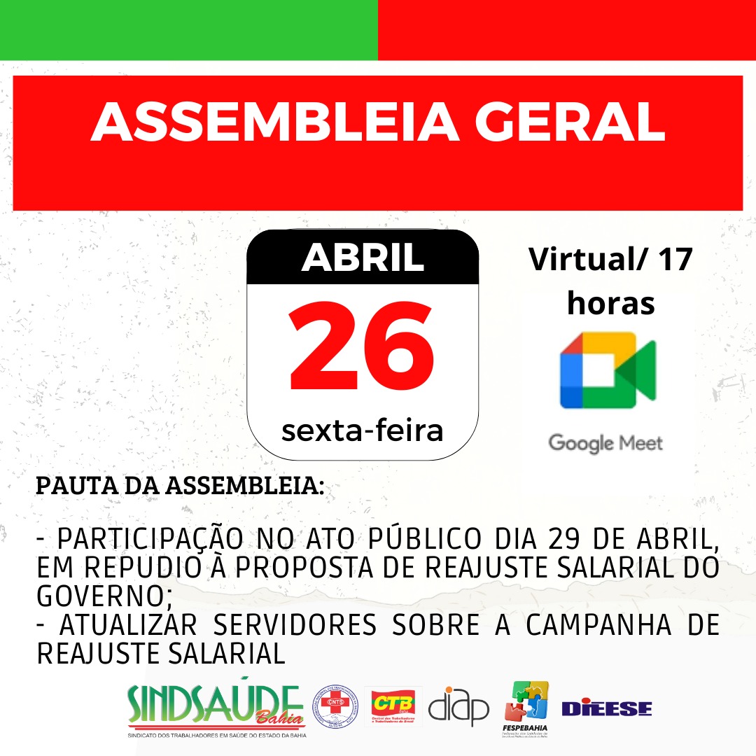 A próxima sexta-feira, dia 26 de abril, o Sindsaúde Bahia realiza Assembleia Geral on line, às 17h, onde vai discutir a participação dos servidores da saúde no Ato Público convocado pela FESPBA para o dia 29, a ser realizado às 9h, em frente à sede do Centro de Operações e Inteligência de Segurança Pública 2 de Julho (COI), no Centro Administrativo da Bahia (CAB) e atualizar os servidores sobre a campanha pelo reajuste salarial.