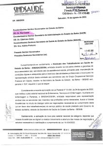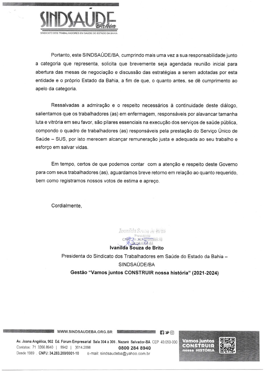 O Sindsaúde Bahia encaminhou, nesta segunda-feira 15, ao governador da Bahia, Rui Costa, ao Secretário de Administração do Estado, Edelvino Reis e a Secretária de Saúde do Estado, Adélia Pinheiro, um ofício solicitando a abertura de mesas de Conversa para a implantação do piso salarial da enfermagem de acordo dom a Lei Federal Nº 14.434/22, sancionada no último dia 04 e que entrou no dia 05. entrou em vigor nesta sexta-feira.