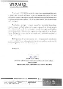 Está é mais uma ação da presidente Ivanilda Brito, que tem como uma de suas principais preocupação, a melhoria da qualidade de vida dos Servidores da Saúde. O ofício já foi protocolado na Casa Civil do Estado.