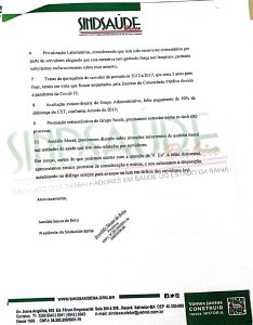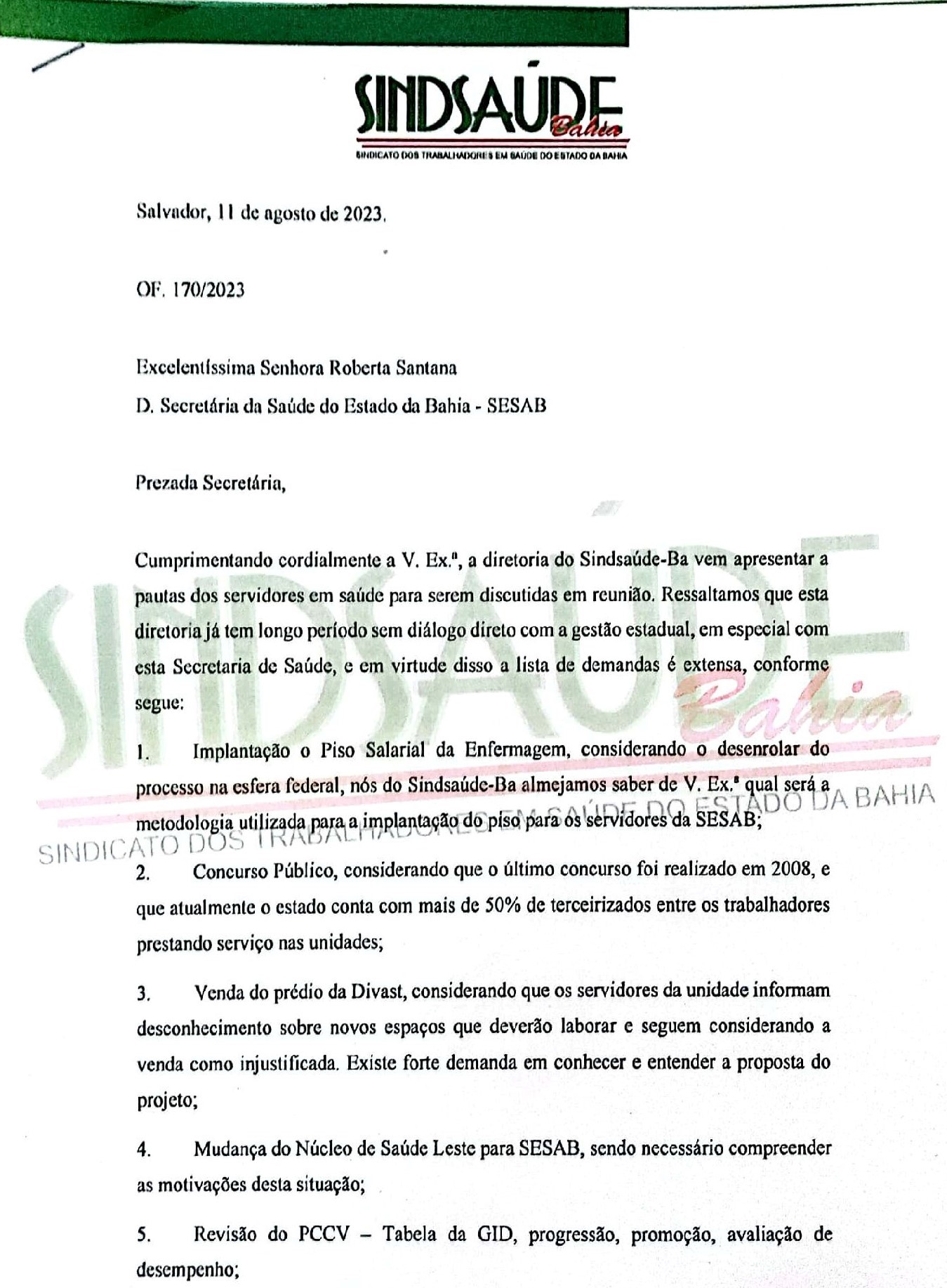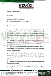 Sindsaúde Bahia solicita, em ofício, reunião com a secretária estadual de saúde para discutir assuntos de interesse dos servidores da saúde
