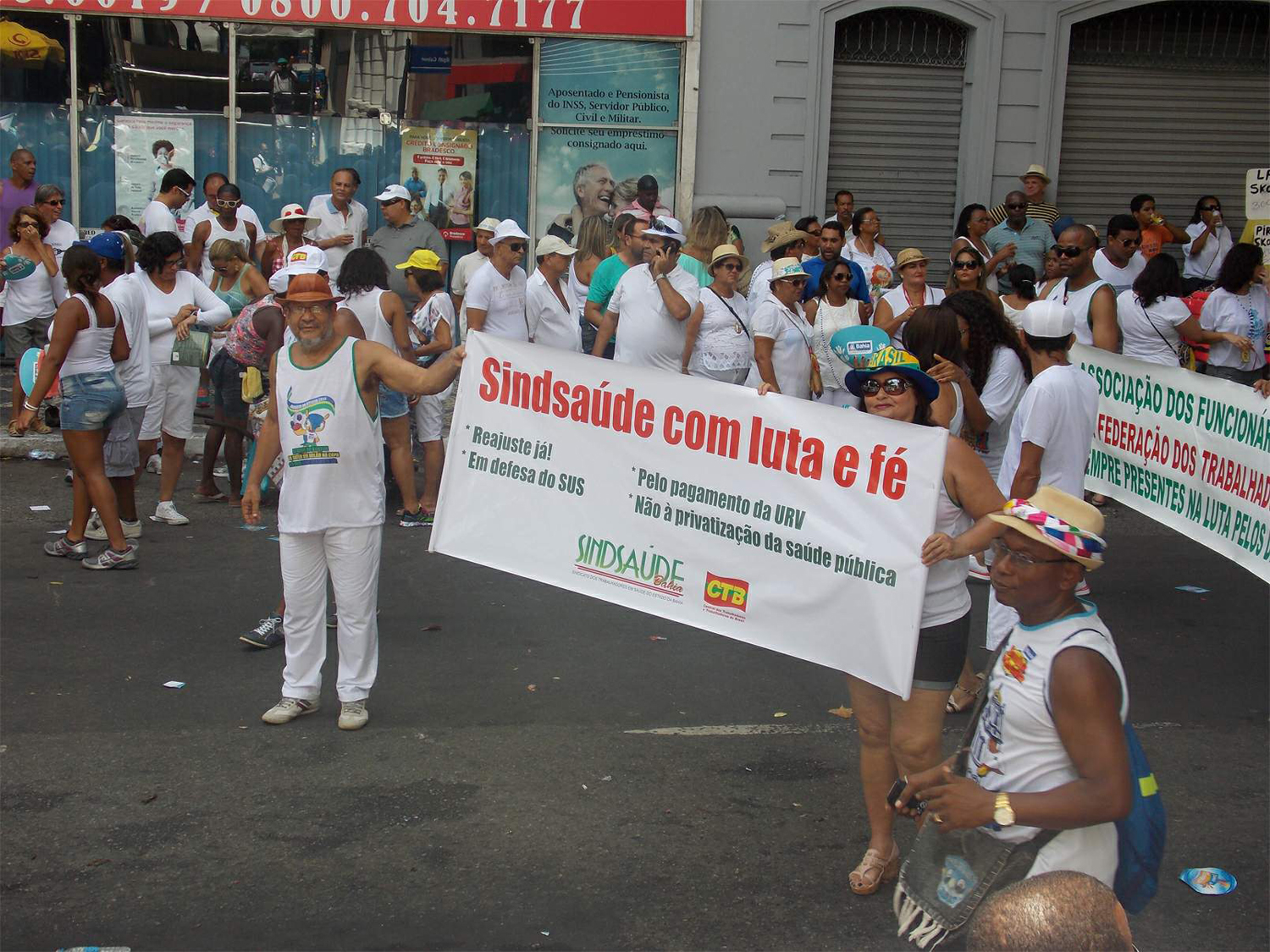 “Senhor do Bonfim, para bater um bolão na Copa, só com a URV e o reajuste já!” foi o slogan usado pelos servidores que levou às ruas da Cidade Baixa faixas, cartazes e camisas padronizadas para protestar. Durante o cortejo, o Sindsaúde também levantou as bandeiras de luta da específicas da categoria como a não privatização do Hospital Manoel Victorino e a defesa do SUS.