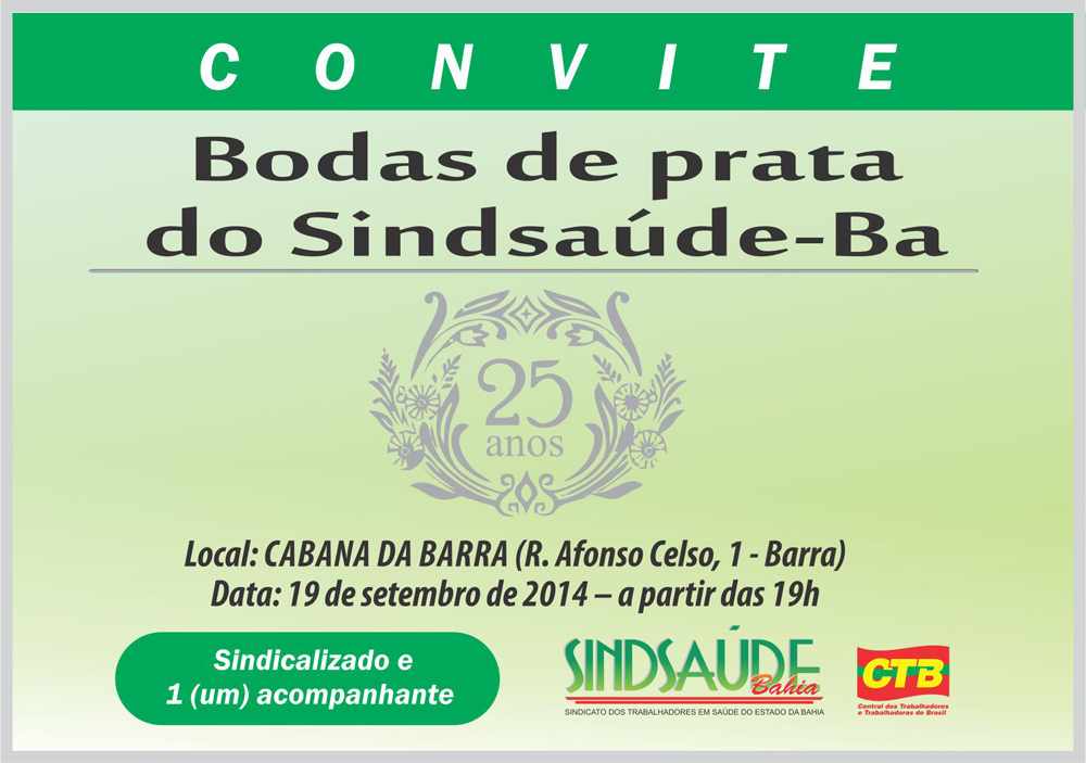 O Sindsaúde convida seus associados para a festa de aniversário de 25 anos da entidade, que será realizada no dia 19 de setembro (sexta), na Cabana da Barra (Rua Afonso Celso, 1 – Barra), a partir das 19h. Associados com direito a um acompanhante. Adquiram seu convite na sede do sindicato, em Nazaré. Mais informações pelo telefone 3266-8940/41.