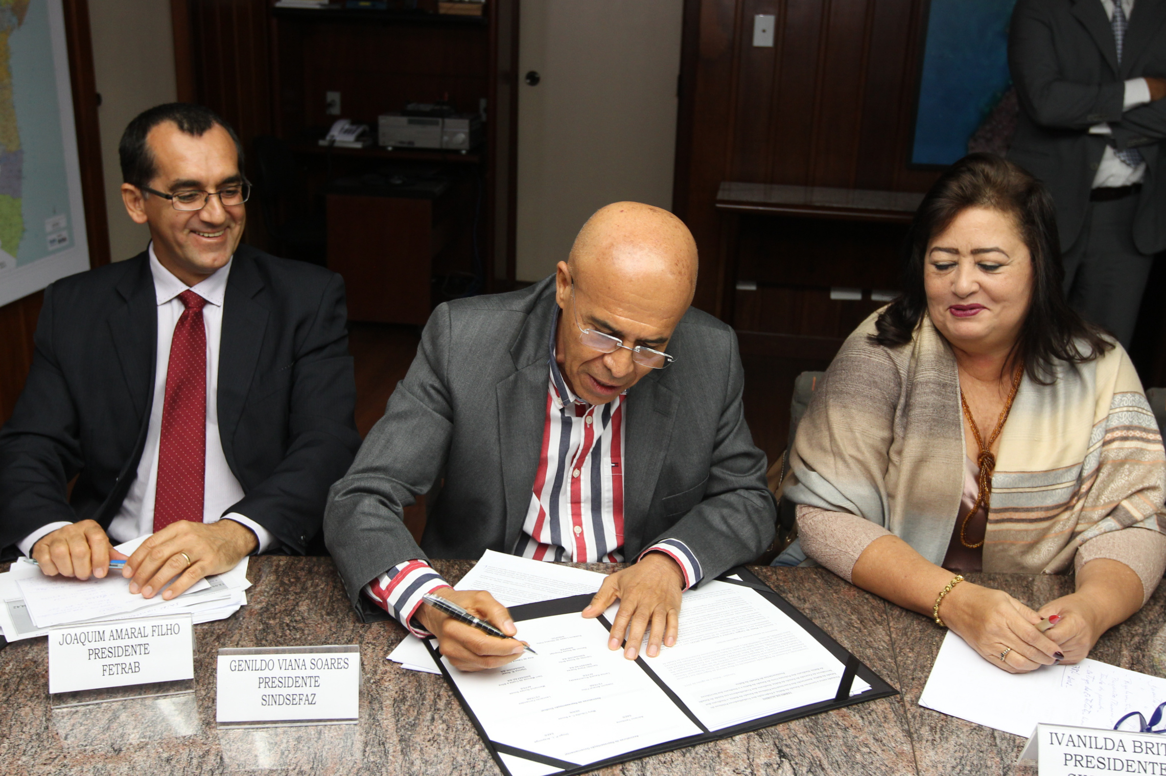 O acordo foi firmado entre governo estadual, a Fetrab, a Afpeb, o Sindsefaz, o Sindsaúde, o Sinspeb, o Sindipoc e contou com a presença da secretária das Relações Institucionais, Cibele Carvalho, Secretário da Saeb, Edelvino Góes, Superintendente de RH da Saeb, Adriano Tambone e Diogo Pedreira jurídico da SAEB.