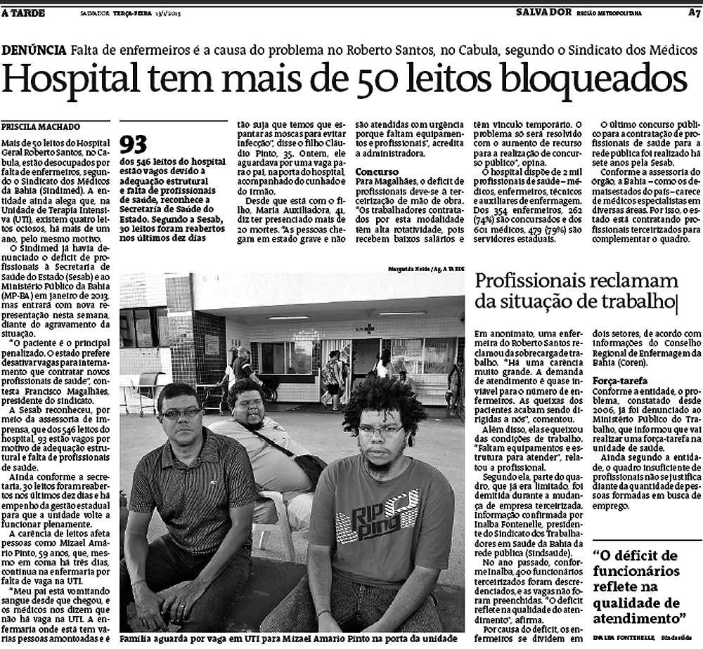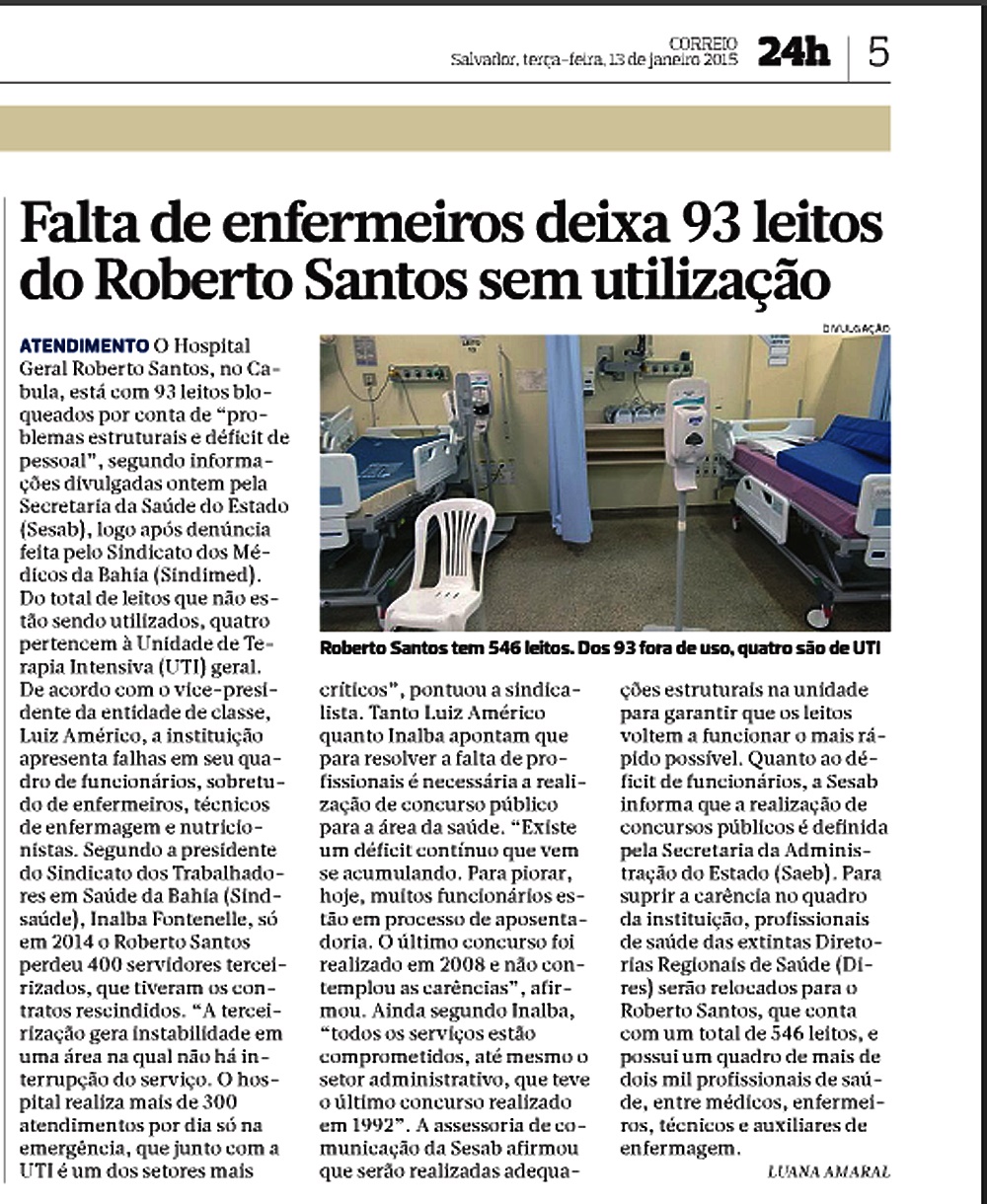 Dando continuidade à luta pela melhoria das condições de trabalho e da assistência à população, o Sindsaúde, juntamente com o Sindimed, cobram da Sesab soluções para o déficit de profissionais que atinge toda a rede pública de Saúde na Bahia. Nesta terça-feira (12), as entidades denunciaram o bloqueio de mais de 50 leitos no Hospital Geral Roberto Santos (HGRS), por falta de profissionais do setor enfermagem e demais categorias.