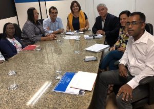 A reunião contou com a participação do diretor jurídico do Sindsefaz Joaquim Amaral, o superintendente de Recursos Humanos da Saeb Adriano Tambone, a coordenadora de articulação social da Serin Mary Cláudia Cruz e Souza.