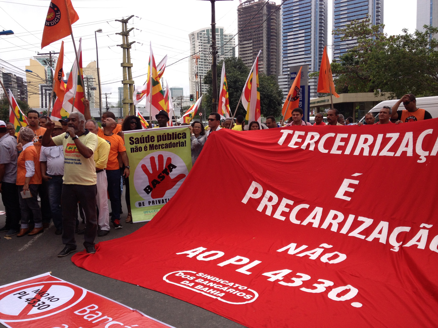 O Sindsaúde-Ba marcou presença na manifestação nacional contra o Projeto de Lei 4330/2004, que permite a terceirização sem limites nos setores público e privado, nesta terça-feira (6). Na Bahia, o ato foi realizado em frente à Federação das Indústrias do Estado (Fieb), no Stiep.