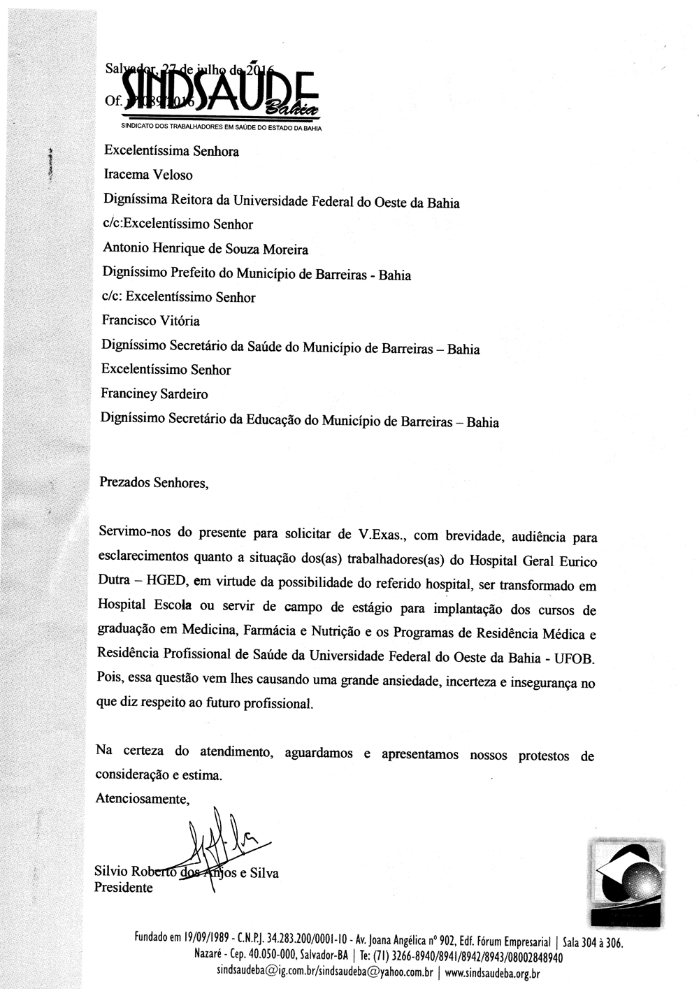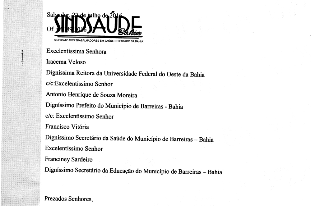 Diante da insegurança e dúvida dos trabalhadores, o Sindsaúde encaminhou ofício, solicitando audiência para a Reitora da Universidade Federal do Oeste da Bahia, Iracema Veloso, o prefeito de Barreiras, Antonio Henrique de Souza Moreira, o secretário da Saúde do Município de Barreiras, Francisco Vitória e o Secretário de Educação de Barreiras, Franciney Sardeiro.