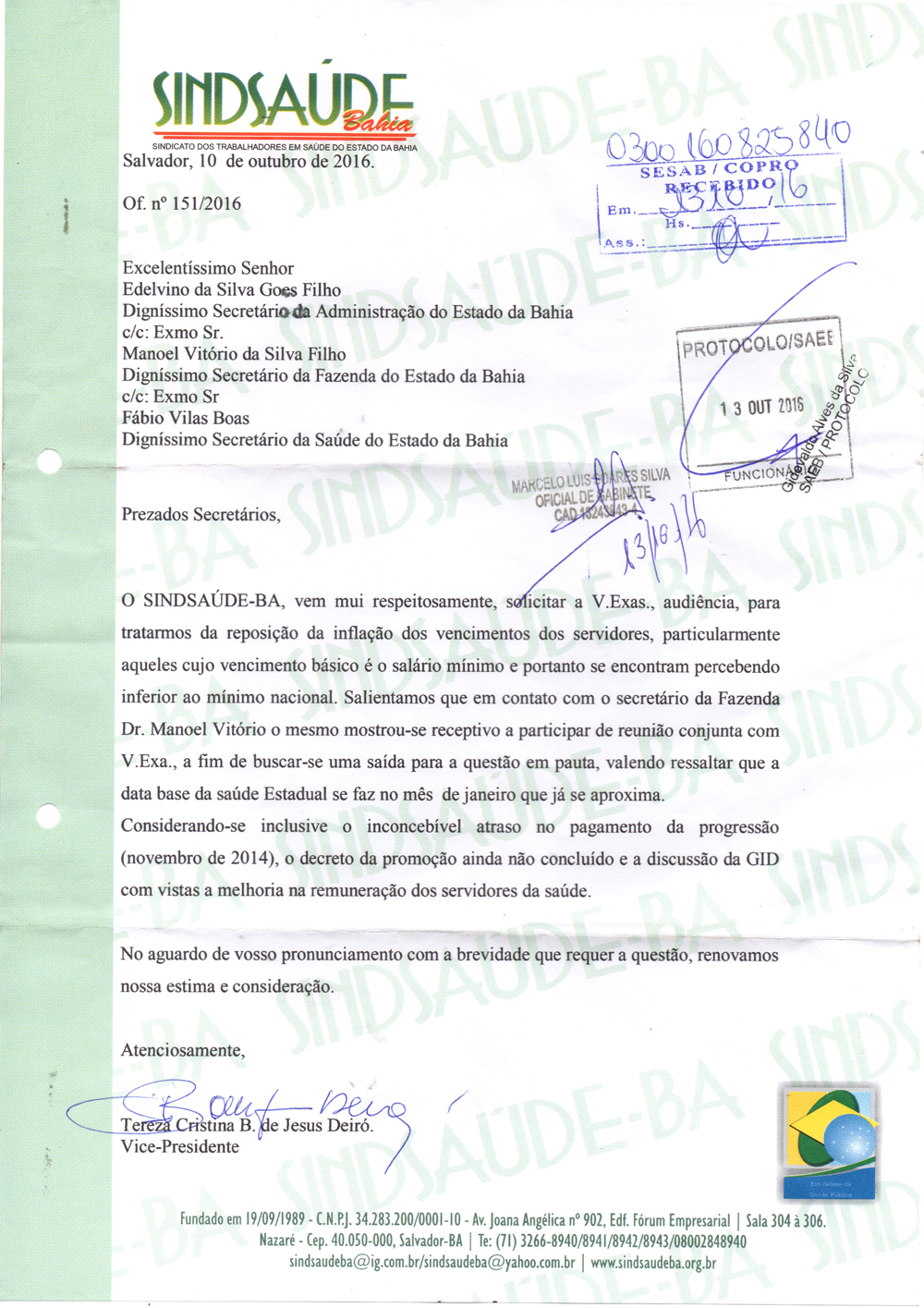 A diretoria do Sindsaúde-Ba encaminhou oficio solicitando uma audiência conjunta com os secretários da Saúde, Fábio Vilas-Boas, da Administração, Edelvino Goés e da Fazenda, Manoel Vitório para cobrar soluções urgentes para demandas antigas da categoria. Tais respostas inclui a reposição salarial (inflação 2015-10,63%) dos servidores estaduais, sobretudo daqueles trabalhadores que se encontram com salário base abaixo do mínimo nacional.