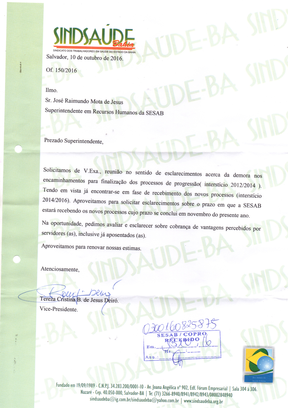 A diretoria da entidade também encaminhou ofício para o superintendente de Recursos Humanos da Sesab, José Raimundo Mota de Jesus, reiterando o pedido de encaminhamento dos processos de Progressão concluídos, para a SAEB dar consecução ao pagamento devido aos trabalhadores, tendo em vista, que o  novo interstício 2014/2016, vence em novembro desse ano.
