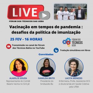 O Fórum dos Técnicos promoverá nesta quinta-feira (25/02), às 16h, live com o tema “Vacinação em tempos de pandemia: desafios da política de imunização”. O debate contará com a participação de Aladilce Souza, representante do Comitê Baiano Vacina pelo SUS Já!, Ivanilda Brito, presidente do SindSaúde-BA e Lacita Menezes, enfermeira, profa. assistente DCS e doutoranda em Saúde Coletiva pela UFBA. O evento será transmitido no canal no YouTube do Fórum dos Técnicos da Bahia.